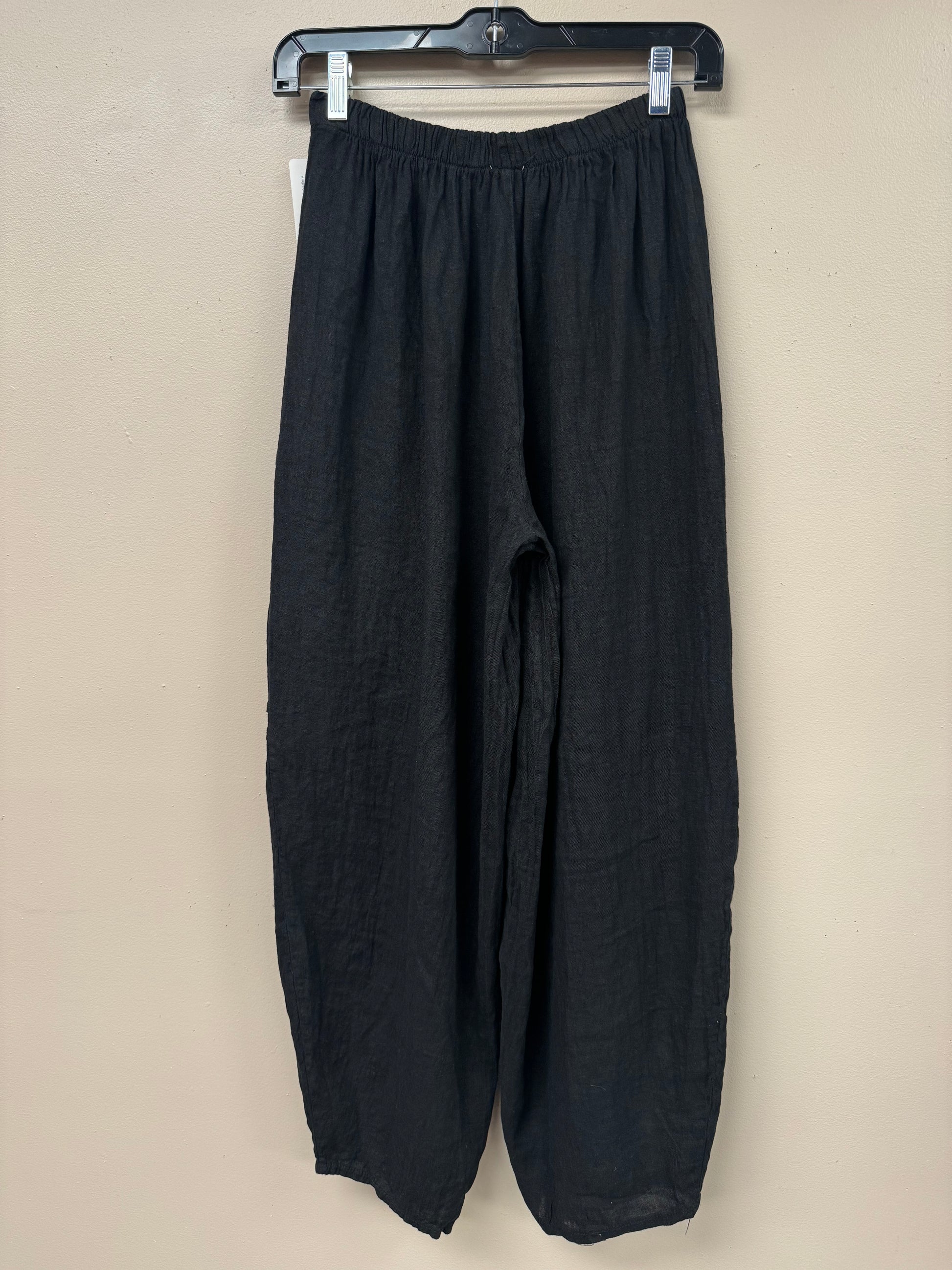 Experience effortless elegance with these Italian linen barrel leg pants. Designed for a loose, comfortable fit with an elastic waist, they adapt to sizes S through XL. Featuring two front pockets and a unique design, these pants are perfect for beach days, easy travel, and casual outings. Their breathable fabric and relaxed style make them both fun and refined, providing an easy-to-wear option that blends comfort and sophistication seamlessly. G31063.