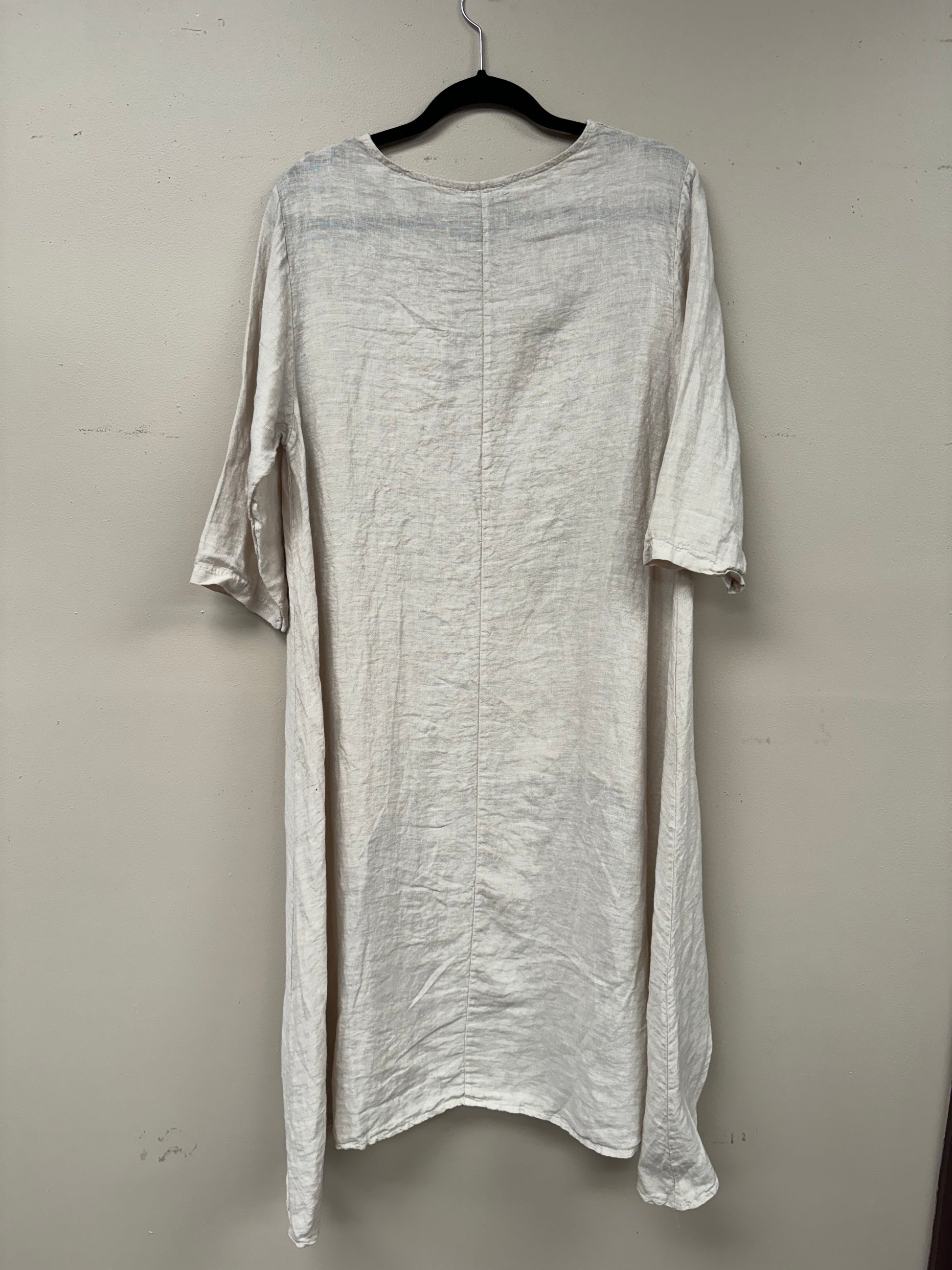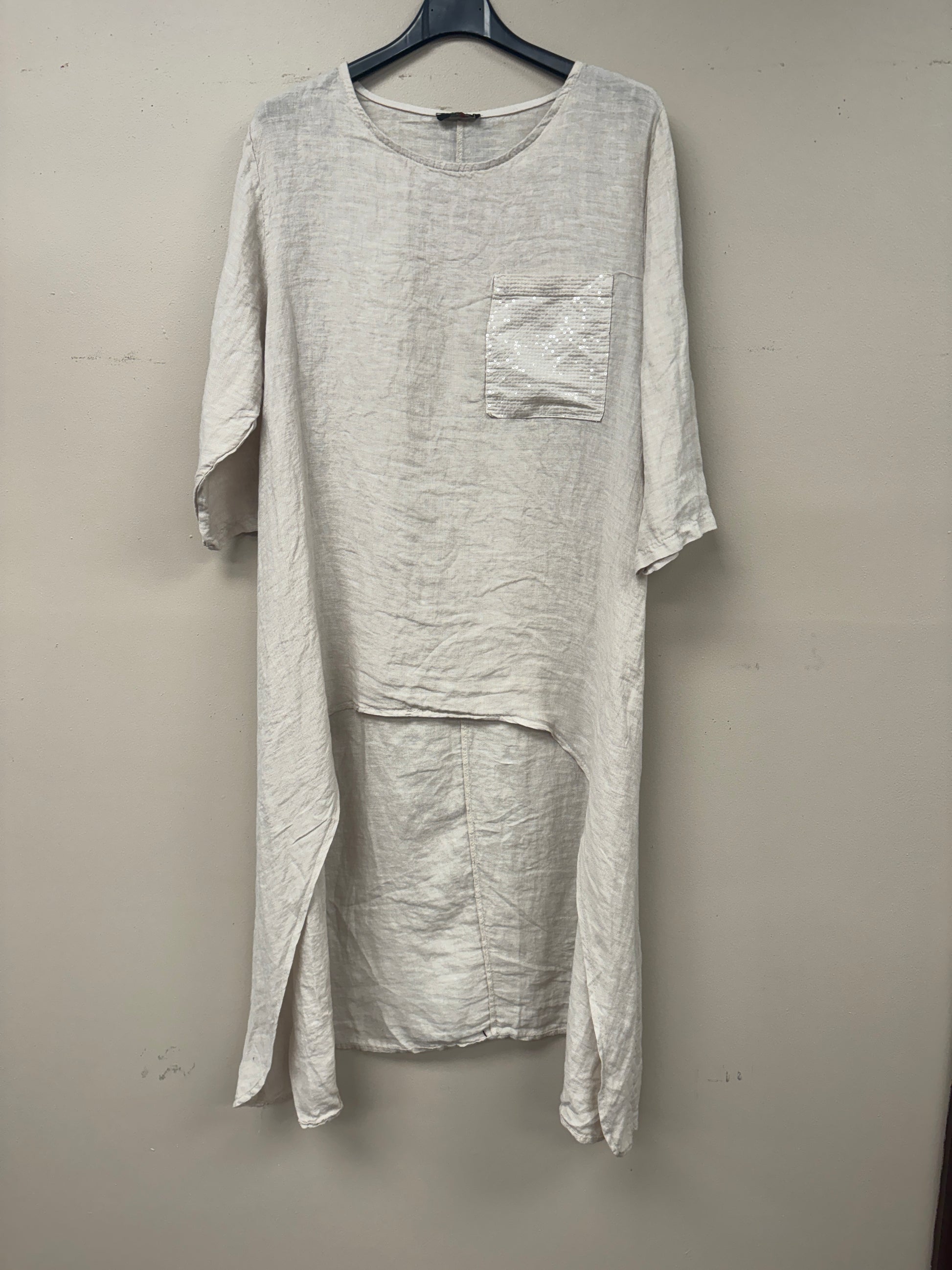 Indulge in luxury with our Italian linen Hi-low blouse. Featuring a graceful Hi-Low effect and a stunning sequence pocket detail, this blouse is both elegant and unique. The soft and comfortable fabric is perfect for any occasion and the rolled short sleeve can be worn in multiple ways. Elevate your wardrobe with this exclusive piece.