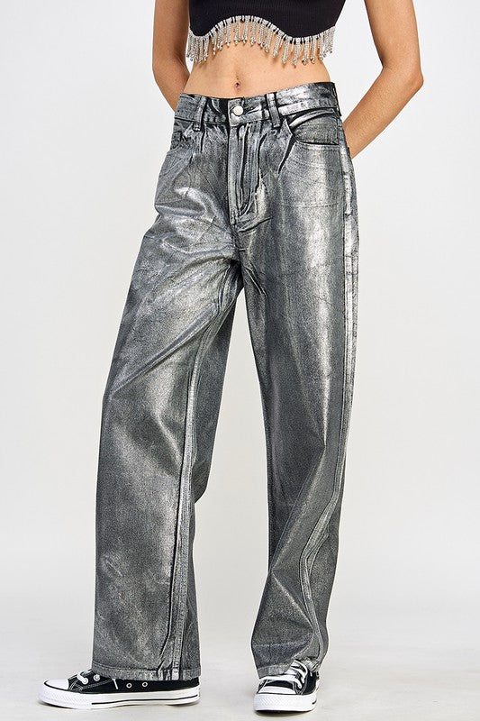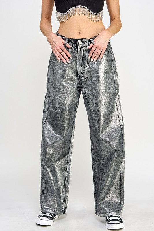 Introducing The Metallic Jean, a luxurious twist on a classic wardrobe staple. Crafted from metallic silver denim, these on-trend jeans offer the perfect balance of style and comfort. With flattering silhouettes, belt loops, five pockets, and a front button closure, they bring timeless sophistication into any look.