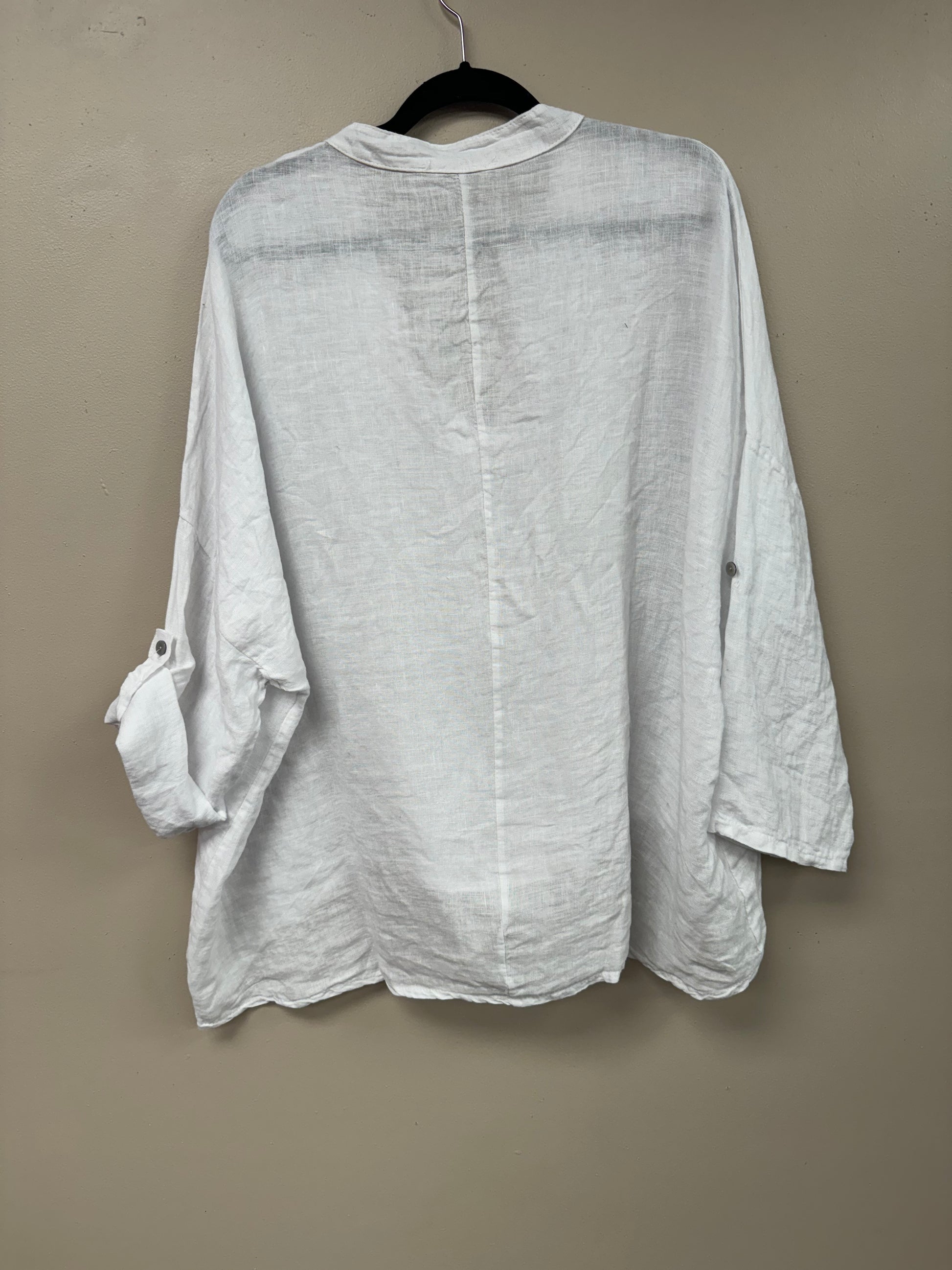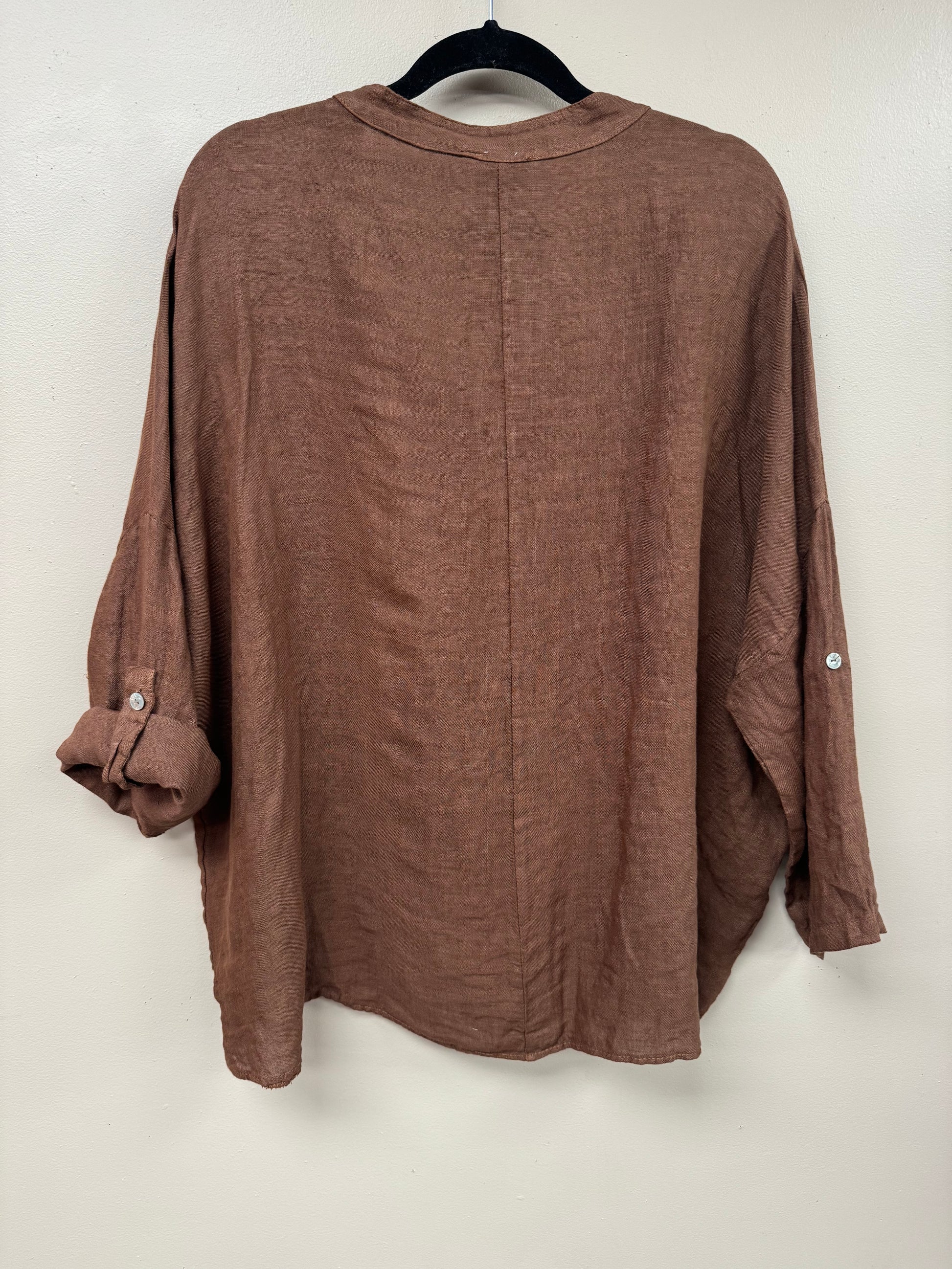 Made in Italy linen shirt with a relaxed, comfy fit that suits sizes S to XL. It features a chic V-neck and long sleeves with buttons, so you can easily roll them up for a fresh twist. Effortlessly stylish and versatile, this top blends comfort with a touch of elegance—perfect for dressing up or down. A must-have for anyone wanting to look polished without the fuss!