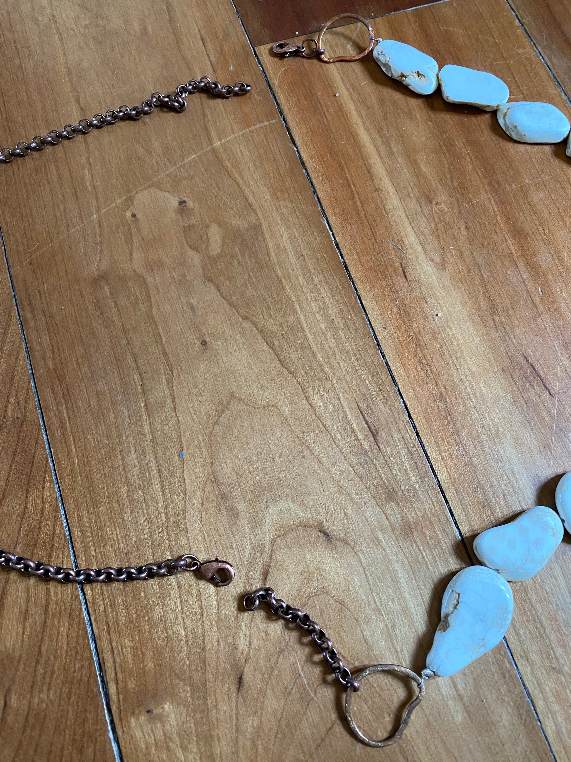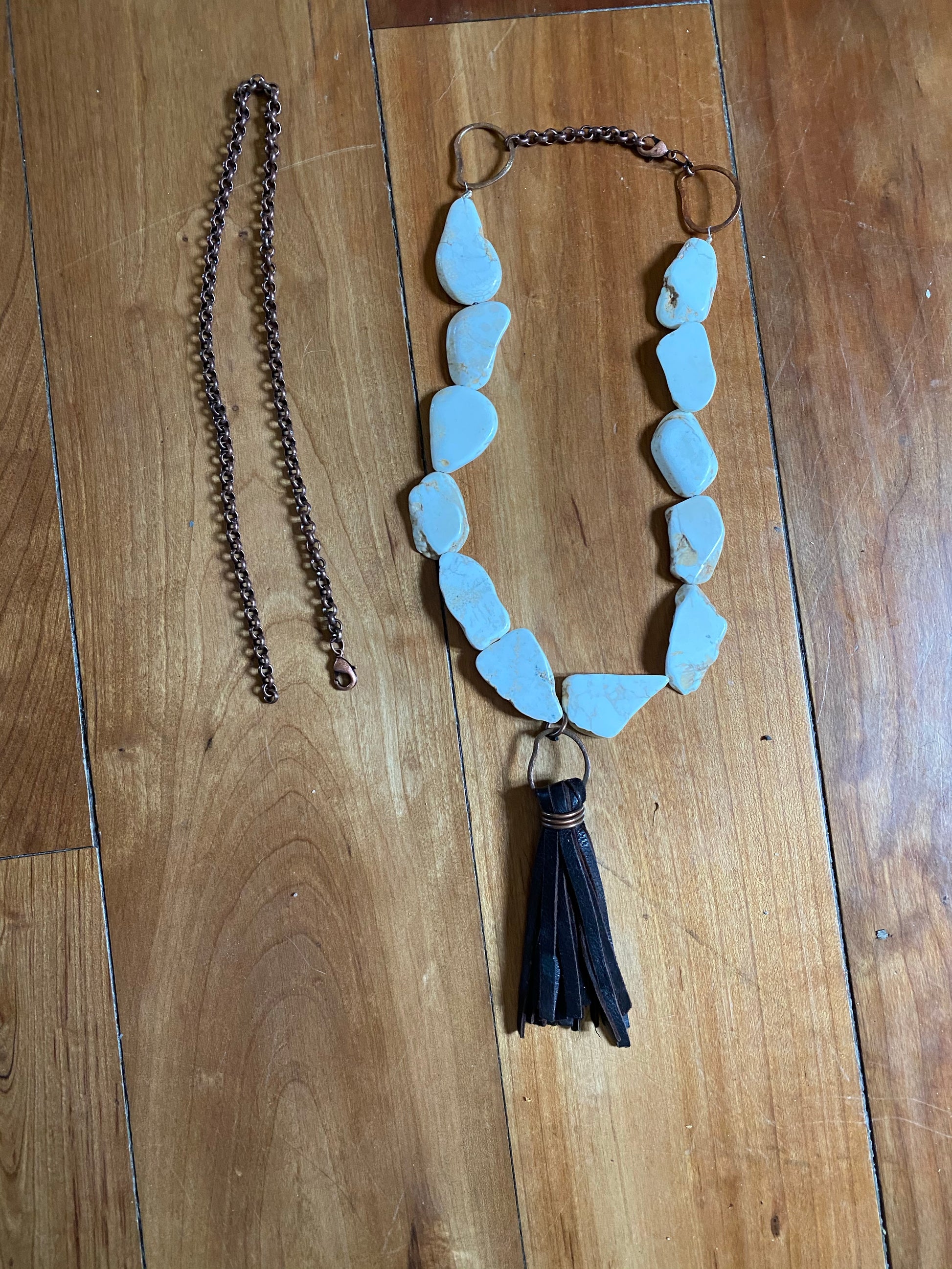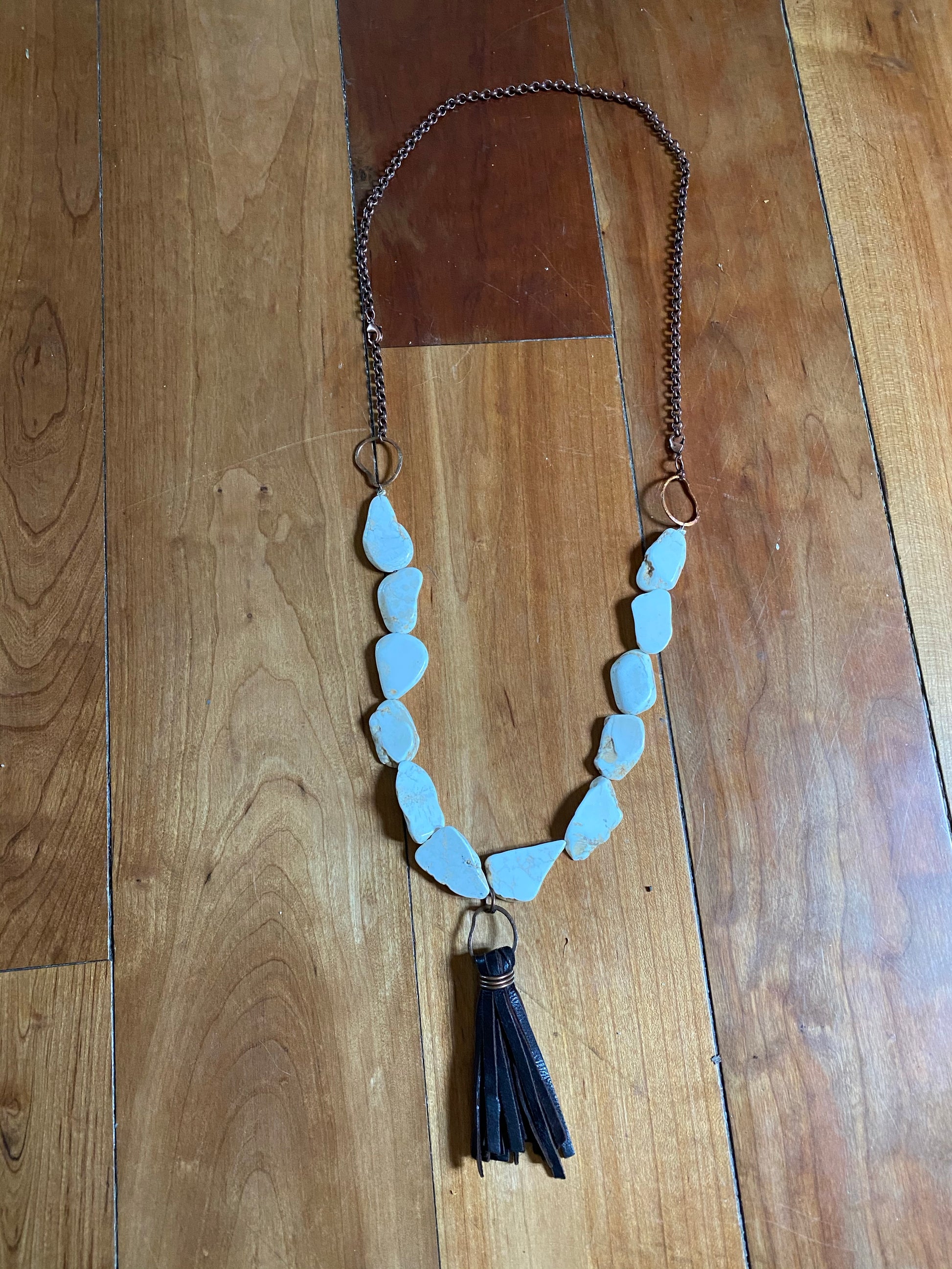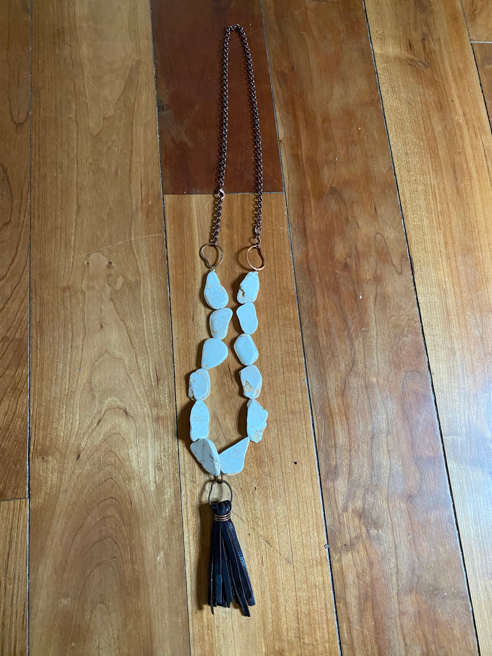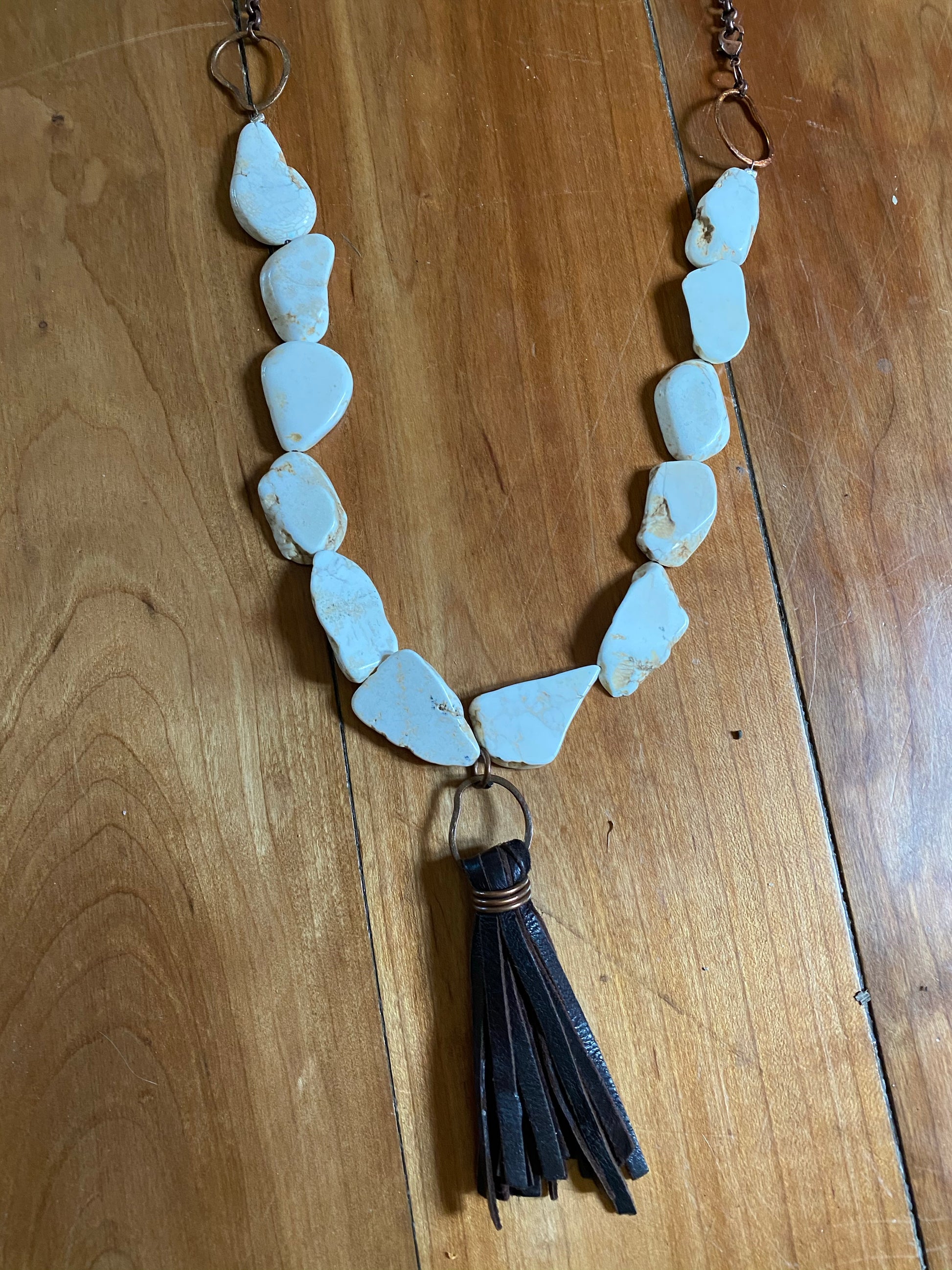 Unique necklace made of copper, leather and white magnesite. This necklace can be worn short (18” - 20” long) or long with a copper chain extender (included).
